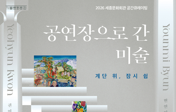 문화저널코리아 오형석 기자 |공연을 기다리는 순간부터 막이 내린 이후까지, 관람객이 오르내리던 계단은 미술관이 된다. 세종문화회관(사장 안호상)은 6월 28일까지 세종문화회관 대극장 계단에서 2026 세종문화회관 공간 큐레이팅 전시 '공연장으로 간 미술'을 개최한다. '공연장으로 간 미술'은 예술이 공연장의 경계를 넘어 시민의 일상 공간에서 경험될 수 있도록 기획된 연간 시리즈 전시다. 2025년에는 이세현, 이동기, 변경수, 정다운, 네 명의 작가가 참여해 세종문화회관 대극장과 극장 옥외 공간을 미술관으로 전환, 하나의 새로운 예술을 선보였으며 관람객들로부터 긍정적인 반응을 얻었다. 이러한 흐름을 이어 2026년에는 ‘계단 위, 잠시 쉼’이라는 부제로, 많은 관람객이 오가는 대극장 계단 공간을 메인으로 새로운 전시를 선보인다. 대극장 계단은 공연 전후의 기대와 여운이 교차하는 장소로, 관객이 잠시 머무는 동안 감각을 환기할 수 있는 공간이기도 하다. 이번 전시는 이러한 공간적 특성에 주목해, 공연장 일상 공간 속에서 예술을 통해 ‘쉼’을 경험할 수 있는 새로운 방식을 제안한다. 이번 전시는 권여현, 변연미 두 작가가 참여한다. 권여현은 한국 동시대 회화를