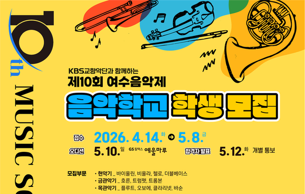 문화저널코리아 오형석 기자 |여수시가 주최하고 KBS교향악단과 재단법인 여수음악제가 주관하는 ‘제10회 여수음악제 음악 학교’ 참가자 모집이 다음달 8일까지 진행된다. 대상은 전라남도에 거주하는 초등학교 3학년부터 고등학교 2학년까지의 청소년이다. 현악, 관 악, 타악기 등 해당 악기를 2년 이상 배운 학생이면 지원할 수 있다. 참가 신청은 내달 8일 오 후 6시까지 여수음악제 사무국으로 접수하면 된다. 선발된 학생들은 5월부터 9월까지 KBS교향악단 단원들로부터 정기 합주를 포함한 다양한 전 문 음악 교육을 받게 된다. 특히 이번 오디션을 통해 선발된 수강생들은 ‘거장과의 만남’ 프로그램을 통해 올해부터 KBS 교향악단 제10대 음악감독에 취임한 정명훈 지휘자가 직접 이끄는 오케스트라 리허설에 참여할 수 있다. 또 교육과정을 통해 우수한 성과를 거둔 학생에게는 제10회 여수음악제 폐막 무대에 올라 정명훈 지휘자, KBS교향악단과 함께 연주하는 특별한 기회가 주어진다. 올해로 10주년을 맞은 여수음악제는 ‘2026 여수세계섬박람회’와 연계해 8월 29일부터 9월 5 일까지 여수 일원에서 열린다. 한편 이번 음악제는 세계인이 함께 즐기는 K-클래식을 대표 음악