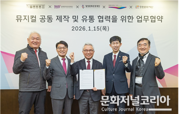 문화저널코리아 오형석 기자 |세종문화회관(사장 안호상)이 부산·경남을 대표하는 공공 공연장들과 손잡고 서울과 지역 간 상생을 기반으로 한 뮤지컬 공동제작·유통 협력에 나선다. 세종문화회관은 15일 김해문화관광재단, 밀양문화관광재단, 영화의전당, 창원문화재단과 함께 ‘뮤지컬 공동 제작 및 유통 협력을 위한 업무협약(MOU)’을 체결했다고 밝혔다. 이번 협약은 서울과 지역이 함께 참여하는 창작·제작·유통 협력 체계를 구축해 한국 공연예술 생태계의 균형 있는 발전을 도모하기 위해 추진됐다. 협약식에는 각 기관 대표 및 관계자들이 참석해 공공 공연장 간 협력을 통해 제작 역량과 자원을 공유하고 지속 가능한 협력 모델을 구축해 나가기로 뜻을 모았다. 이를 통해 세종문화회관은 서울시뮤지컬단이 축적해 온 전문 제작 시스템과 창작 자산을 지역 공연장과 공유하고 지역 공연장은 제작 과정 전반에 직접 참여하며 공동제작 경험과 역량을 함게 쌓아가게 된다. 주요 협약 내용은 △뮤지컬 공동 제작 및 콘텐츠 유통 협력 △서울–지역 간 안정적인 제작·배급 체계 구축 △상생 발전을 위한 공동 사업 추진 등이다. 협약의 첫 결실로, 세종문화회관 서울시뮤지컬단과 부산·경남 4개 공연장은 뮤