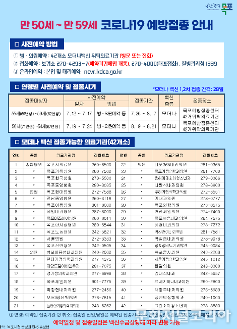 문화저널코리아 조정일 기자 | 목포시가 질병관리청 계획에 따라 만 55세(66년생)~59세(62년생) 대상으로 오는 12일부터 사전 예약을 시작해 26일부터 예방접종센터와 42개소 병·의원에서 예방접종을 실시한다.