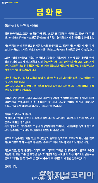 문화저널코리아 조정일 기자 | 이성호 양주시장이 12일 사회적 거리두기 4단계 시행에 따른 ‘시민께 드리는 담화문’을 발표하며 외출 및 모임 자제 등 코로나19 확산을 막기 위한 방역수칙 철저 준수에 시민 여러분의 적극적인 협조를 당부했다.