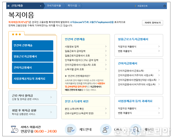 납세서비스 재설계 차원에서 홈택스에 산재되어 있던 복지세정 관련 메뉴를 「복지이음」 포털로 통합해 이용편의를 제고했다.