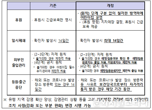이번 지침 개정을 통해, 지자체별로 각기 다른 방역 상황에 유연하게 대처하고, 역학조사에 근거한 최소한의 조치로 어린이집 돌봄 기능을 유지하는 등 현장의 요구를 상당 부분 해소할 수 있을 것으로 보인다.