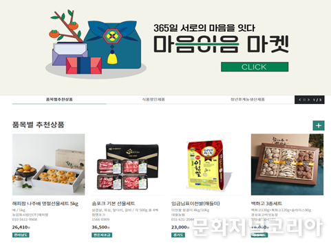 ‘마음이음마켓’은 지자체 및 유관기관으로부터 추천을 받은 지역 특산품, 식품명인 및 청년후계농 제품 등 우수 농축수산물 선물 꾸러미로 구성된 전자 상품모음집(e-catalogue)이다.