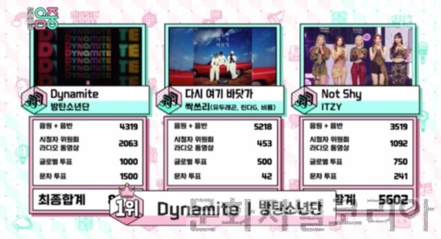 방탄소년단은 29일 방송된 MBC TV '쇼! 음악중심'에 출연하지 않고도 신곡 '다이너마이트(Dynamite)'로 8월 4주차 1위에 등극했다.