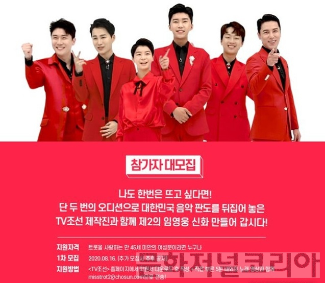 '미스트롯2' 오디션은 트롯을 사랑하는 만 45세 미만의 여성이라면 누구나 지원할 수 있다. 참가 지원서를 작성한 후 간단한 자기소개와 함께 직접 부른 노래가 담긴 5분 내외 영상을 첨부하면 된다.