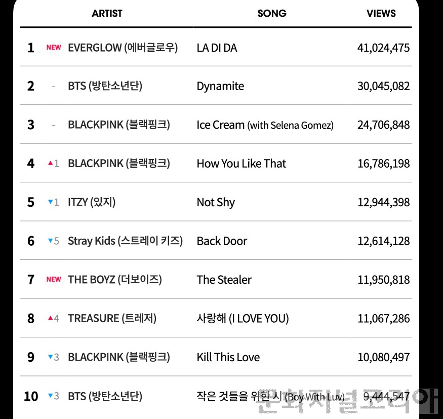 이 외에도 방탄소년단의 ‘다이너마이트(Dynamite)’(3,004만 뷰)를 비롯해 블랙핑크의 ‘아이스크림(Ice Cream(with Selena Gomez))’(2,470만 뷰), 블랙핑크의 ‘하우 유 라이크 댓(How You Like That)’(1,678만 뷰), 있지(ITZY)의 ‘낫 샤이(NOT SHY)’(1,294만 뷰), 스트레이 키즈 ‘백 도어(Back Door)’(1,261만 뷰), 트레저 ‘사랑해(I LOVE YOU)’(1,106만 뷰), 블랙핑크의 ‘킬 디스 러브(Kill This Love)’(1,008만 뷰), 방탄소년단의 ‘작은 것들을 위한 시(Boy With Luv)’(944만 뷰) 등이 주간 케이팝 레이더 TOP10을 차지했다.