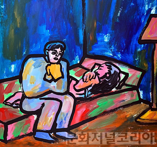 공개된 이미지에는 침대에 누워있는 여자와 그 옆에 걸터앉아 턱을 괴고 먼 곳을 응시하는 한 남자의 모습이 유화 일러스트로 담겼다.