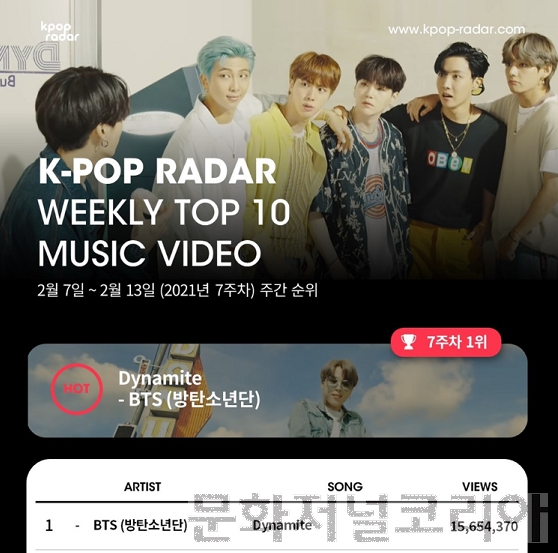 방탄소년단의 ‘Dynamite(다이너마이트)’ 뮤직비디오는 케이팝 레이더 2021년 7주차(2월 7일~2월 13일) 차트에서 1,565만 뷰를 기록하며 또 다시 정상에 올랐다.