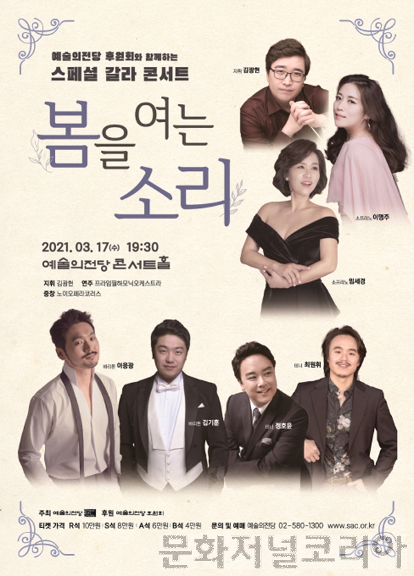예술의전당(사장 유인택)은 예술의전당 후원회(회장 서병기)와 손잡고 3월 17일 오후 7시 30분 콘서트홀에서 스페셜 갈라 콘서트 '봄을 여는 소리' 음악회를 개최한다.