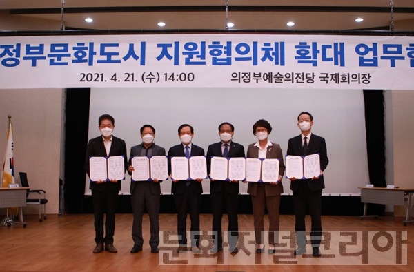 의정부문화재단(대표이사 손경식)은 4월21일 국제회의장에서 의정부시시설관리공단 등 5개 기관을 확대하는 ‘의정부문화도시 지원협의체 업무협약’을 체결했다.[문화저널코리아]