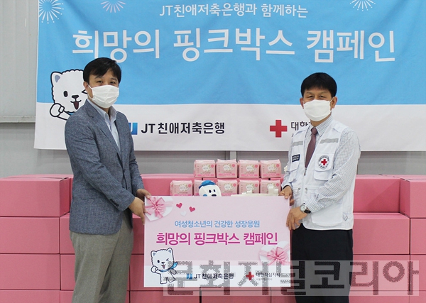 지난 5월 21일 JT친애저축은행(대표 박윤호)이 대한적십자사 서울특별시지사(회장 김흥권)에 취약계층 여성 청소년을 위한 ‘희망의 핑크박스’를 전달했다.[문화저널코리아]
