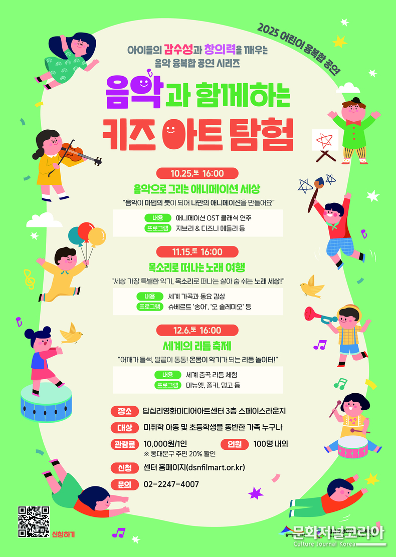 문화저널코리아 김영일 기자 | 동대문문화재단(이사장 이필형) 답십리영화미디어아트센터(이하 ‘센터’)가 2025년 가을, 온 가족이 함께 즐길 수 있는 융복합 교육 공연 시리즈 <음악과 함께하는 키즈 아트 탐험>을 선보인다. 이번 공연은 음악을 기반으로 아이들의 예술적 감수성과 창의력을 깨우기 위해 기획되었으며, 오는 10월 25일, 11월 15일, 12월 6일 토요일 오후 4시에 각기 다른 주제로 관객들을 만날 예정이다.