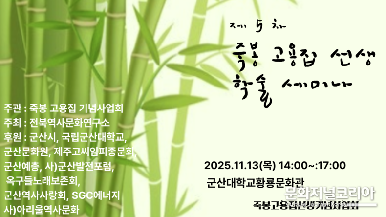 '제5차 죽봉 고용집 선생 학술대회'는 (사)죽봉고용집선생기념사업회가 주관하고 전북역사문화연구소가 주최해 다음 달 13일 오후 2시 군산대학교 황룡문화관 노판순 홀에서 열린다. 이번 학술대회는 고용집 선생을 문학·사상·예술·정치의 다면적 인물로 재정립하고, 향토문화의 정신적 기반으로서 그 의미를 되새기는 데 초점을 둔다.