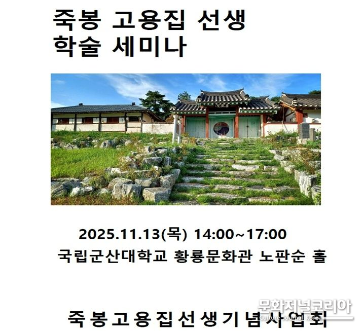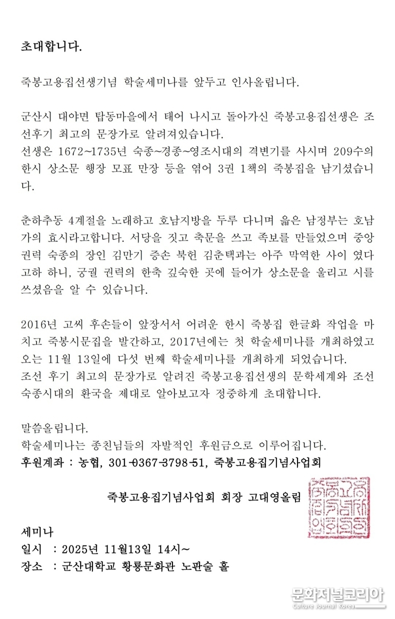 한편 (사)죽봉고용집선생기념사업회 관계자는 "죽봉 고용집 선생은 단지 한 명의 문인이 아니라, 군산 지역 정신문화의 뿌리를 이루는 인물"이라며 "이번 학술대회가 지역 정체성과 문화적 자긍심을 되살리는 계기이자, 조선 후기 문학·사상 연구의 지평을 넓히는 출발점이 될 것"이라고 말했다.