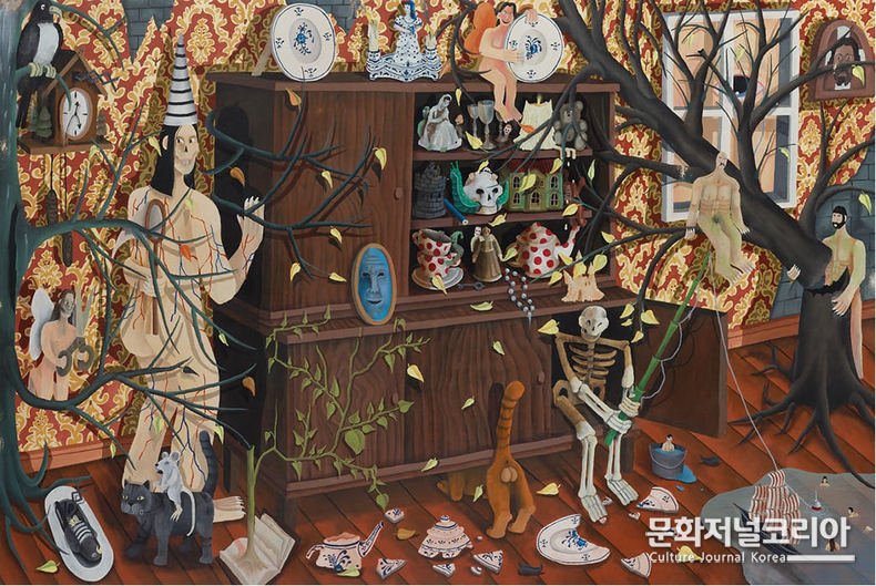 반복적으로 등장하는 ‘나무’는 의식과 무의식, 기억과 생명력을 잇는 상징으로, 논리로 설명되지 않는 감정의 잔류를 시각화한다. 벽면에서 자라나는 형상과 현실 공간으로 걸어나온 이미지들은 관람자를 꿈의 경계로 이끌며, 전시장은 하나의 ‘심리적 연극무대(psychic theatre)’로 변모한다.