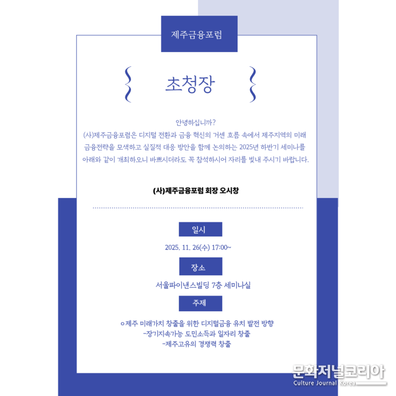 문화저널코리아 오형석 기자 |(사)제주금융포럼(회장 오시창)은 2025년 11월 26일(수) 오후 5시, 서울파이낸스센터 7층 세미나실에서 ‘제주 미래가치 창출을 위한 디지털금융 유치 발전방향’을 주제로 2025 하반기 정기 세미나를 개최한다고 24일 밝혔다.