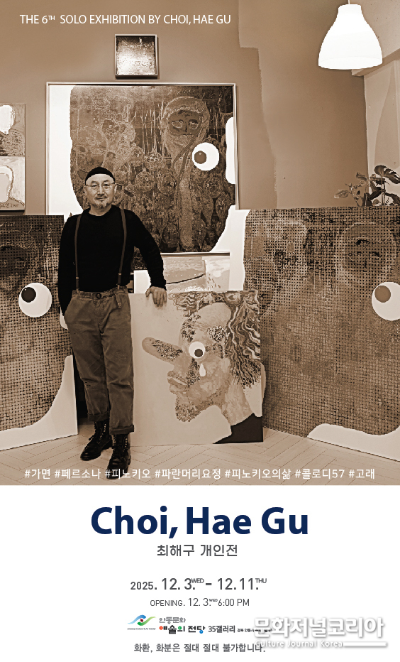 문화저널코리아 오형석 기자 |최해구 작가가 오는 12월 3일부터 11일까지 안동문화예술의전당 35갤러리에서 여섯 번째 개인전을 연다. 이번 전시는 작가가 꾸준히 탐구해온 가면, 페르소나, 피노키오, 고래 등 상징적 이미지를 중심으로 인간 내면의 감정과 기억을 회화적으로 재구성한 신작들을 선보인다.