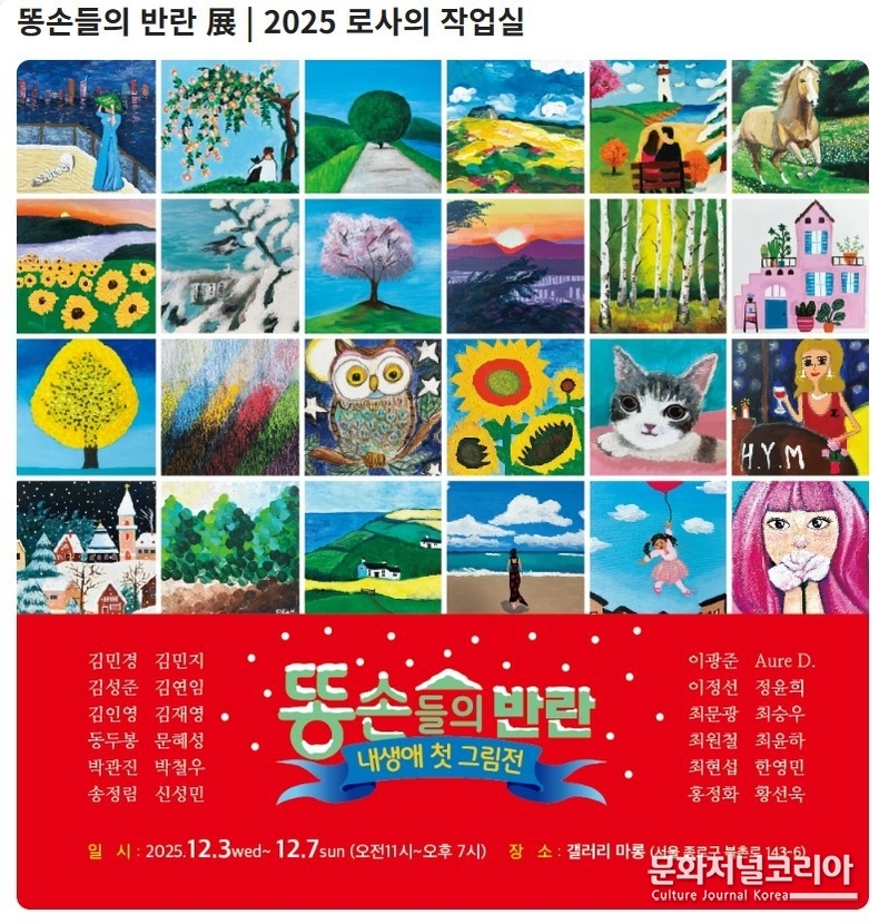 문화저널코리아 오형석 기자 |서울 종로구 북촌로 143-6, 고즈넉한 한옥 길목에 자리한 갤러리 마롱에서 12월 3일(수)부터 7일(일)까지 아주 특별한 전시가 열린다. 이름하여 '제1회 똥손들의 반란 – 내 생애 첫 그림전'. 제목부터 범상치 않은 이 전시는, 평생 그림 한 장 제대로 그려본 적 없던 사람들이 단 하루, 고작 3시간 만에 만들어낸 '기적 같은 작품들'을 정식 갤러리의 화이트큐브에 올려놓는 프로젝트다. 이 전시의 중심에는 감성회화 작가 로사.C(최미진)이 운영하는 '로사의 작업실'이 있다. 그리고 그 공간에서 단 하루 동안 붓을 처음 잡아본 24명의 '초보 작가들'이 있다.