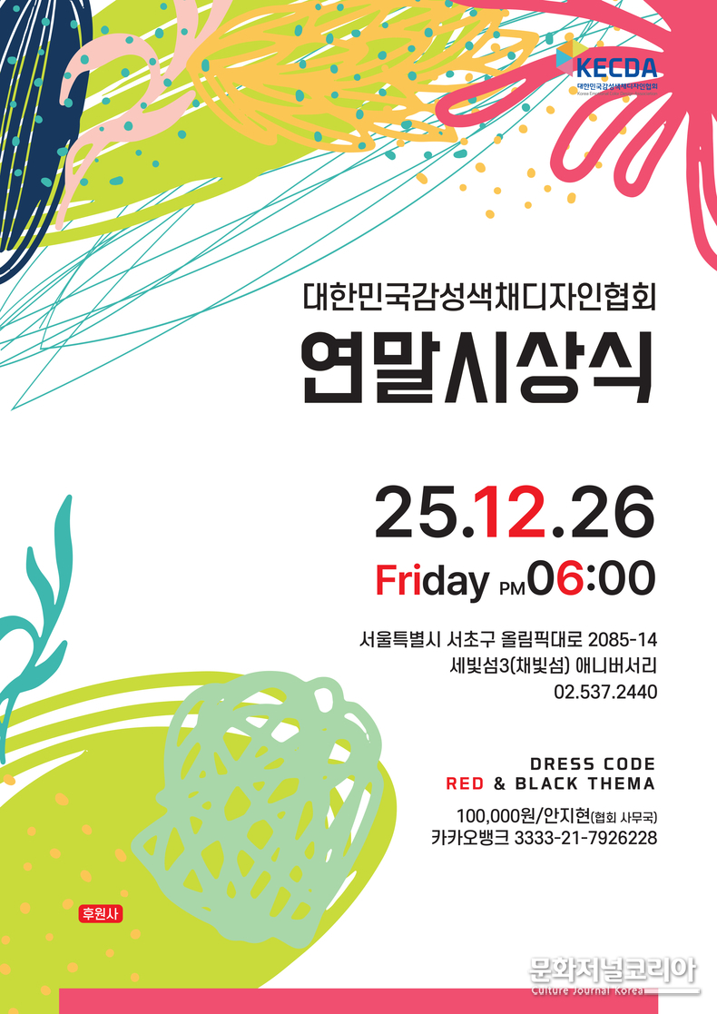 문화저널코리아 오형석 기자 |대한민국감성색채디자인협회(KECDA)가 오는 12월 26일(금) 오후 6시, 서울 서초구 세빛섬 채빛섬(세빛섬 3층 애니버서리)에서 '2025 대한민국감성색채디자인협회 연말시상식'을 개최한다.