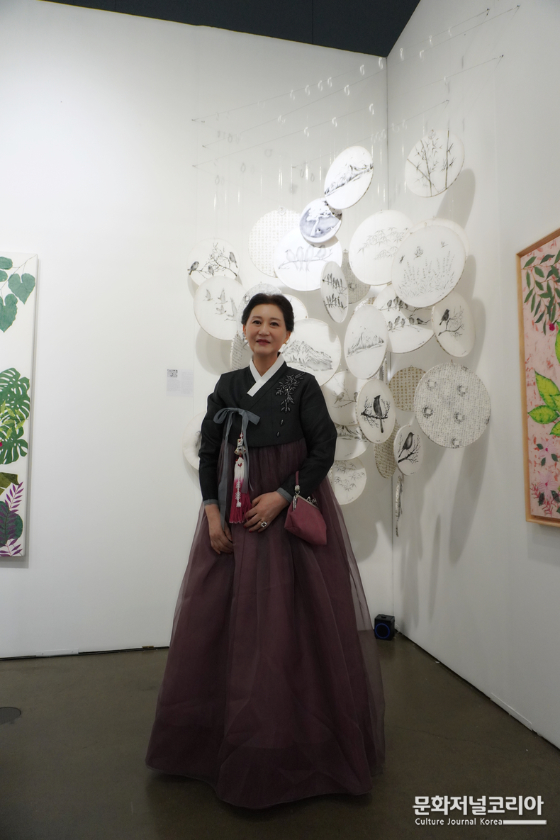미국 로스앤젤레스를 기반으로 활동해 온 서은진 작가는 이번 아트쇼에서 ‘평온한 숲’을 주제로 한지 설치미술 41점을 선보였다. 둥근 원형 대나무 구조물 위에 백색 한지를 붙여 건조한 작품들은 전시 공간 전체를 하나의 숲처럼 구성하며 관객을 작품 안으로 끌어들였다. 단순히 작품을 '보는' 전시가 아니라, 관객이 그 안을 '걷고 머무르며 사유하도록' 설계된 공간 연출이 특징이다.