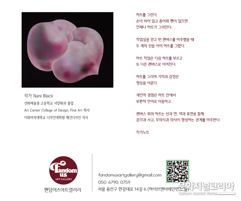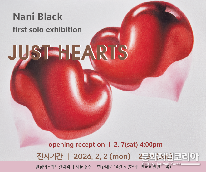 문화저널코리아 오형석 기자 |2월은 발렌타인데이가 있는 사랑의 달이다. 하트는 이 계절을 상징하는 가장 익숙한 이미지다. 그러나 팬덤어스 아트갤러리(대표 정주연)에서 열리고 있는 Nani Black의 첫 개인전 'JUST HEARTS'에서 만나는 하트는 가볍지 않다. 그것은 장식적 기호가 아니라, 한 개인이 삶을 통과하며 얻은 감정과 기억, 그리고 결단의 흔적에 가깝다.