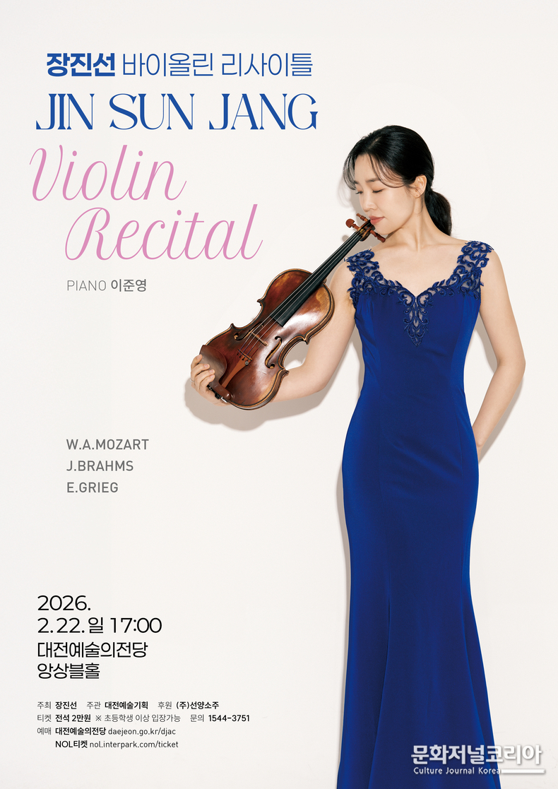 문화저널코리아 오형석 기자 |대전 지역 클래식 음악계에 꾸준히 깊이 있는 울림을 전해온 바이올리니스트 장진선이 오는 2월 22일 오후 5시, 대전예술의전당 앙상블홀에서 리사이틀 무대를 선보인다. 모차르트, 브람스, 그리그의 바이올린 소나타로 구성된 이번 공연은 고전에서 낭만으로 이어지는 음악사적 흐름을 한 자리에서 조망하는 프로그램으로, 대전 시민들에게 정통 바이올린 레퍼토리의 미학을 온전히 경험할 기회를 제공한다.