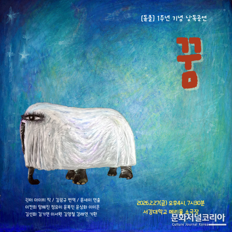 문화저널코리아 오형석 기자 |전쟁은 끝났다고 말할 수 있을까. 폭격이 멎고 총성이 사라진 뒤에도, 인간의 기억과 책임은 과연 제자리를 찾았을까. 희곡읽기 모임 '돌클'의 1주년을 기념하는 낭독공연 '꿈'은 이 오래된 질문을 오늘의 관객 앞에 다시 꺼내 놓는다. 공연은 오는 2월 27일, 서강대학교 메리홀 소극장에서 오후 4시와 7시 30분, 두 차례에 걸쳐 진행된다.