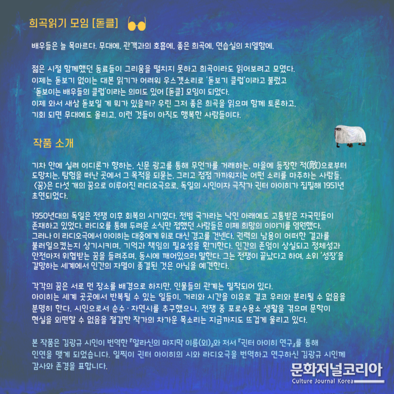 이번 작품은 독일의 시인이자 극작가 귄터 아이히(Günter Eich)가 1951년 집필·초연한 라디오극 '꿈'을 무대 낭독 형식으로 선보이는 공연이다. 아이히는 전후 독일 문학을 대표하는 작가로, '폐허 문학(Trümmerliteratur)'의 흐름 속에서 인간의 존엄, 언어의 책임, 기억의 윤리를 집요하게 탐구해왔다. 특히 라디오극이라는 매체를 통해 대중과 직접 만났던 그는, 전쟁 이후 '회복'이라는 이름 아래 은폐되던 사회의 균열을 소리와 언어로 파고들었다.