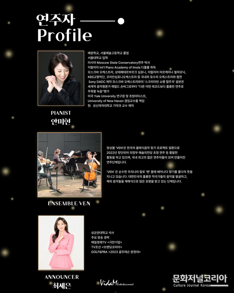 뉴욕 필하모닉 최초 한국인 남성 종신 단원 출신이자 현재 카타르 필하모닉 오케스트라 악장으로 활동 중인 오주영은 세계 주요 무대에서 축적한 음악적 경험을 바탕으로, 이번 공연에서 ‘성과’가 아닌 ‘과정’을 이야기한다. 곡 사이사이 이어지는 아나운서와의 대화를 통해 어린 시절 음악을 처음 만났던 순간부터 세계 무대에서 형성된 음악적 태도, 그리고 현재 음악을 바라보는 시선까지를 자연스럽게 풀어낼 예정이다.