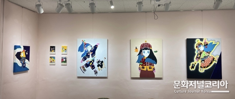 전시장에는 작은 바람개비가 달린 소녀 캐릭터 ‘코링’이 등장하는 작품들이 걸려 있었다. 곰과 호랑이, 그리고 바람개비 장치를 지닌 캐릭터들이 펼치는 서사는 동화처럼 보이지만 그 안에는 환경과 보호, 공존이라는 동시대적 메시지가 담겨 있다.