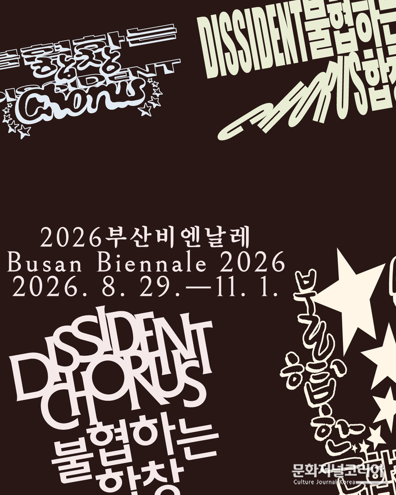 문화저널코리아 오형석 기자 |(사)부산비엔날레조직위원회(이하 조직위, 조직위원장 박형준 부산광역시장)는 8월 29일 개막하는 2026부산비엔날레의 전시 주제 《불협하는 합창(Dissident Chorus)》(가제)을 반영한 키비주얼을 공개했다. 이번 키비주얼은 여러 개의 타이포그래피 에셋을 반복·중첩 배치해 다양한 목소리가 동시에 울려 퍼지는 ‘합창’의 상태를 시각적으로 표현한 것이 특징이다. 2026부산비엔날레는 부산현대미술관과 원도심 일원을 중심으로 개최될 예정이다.