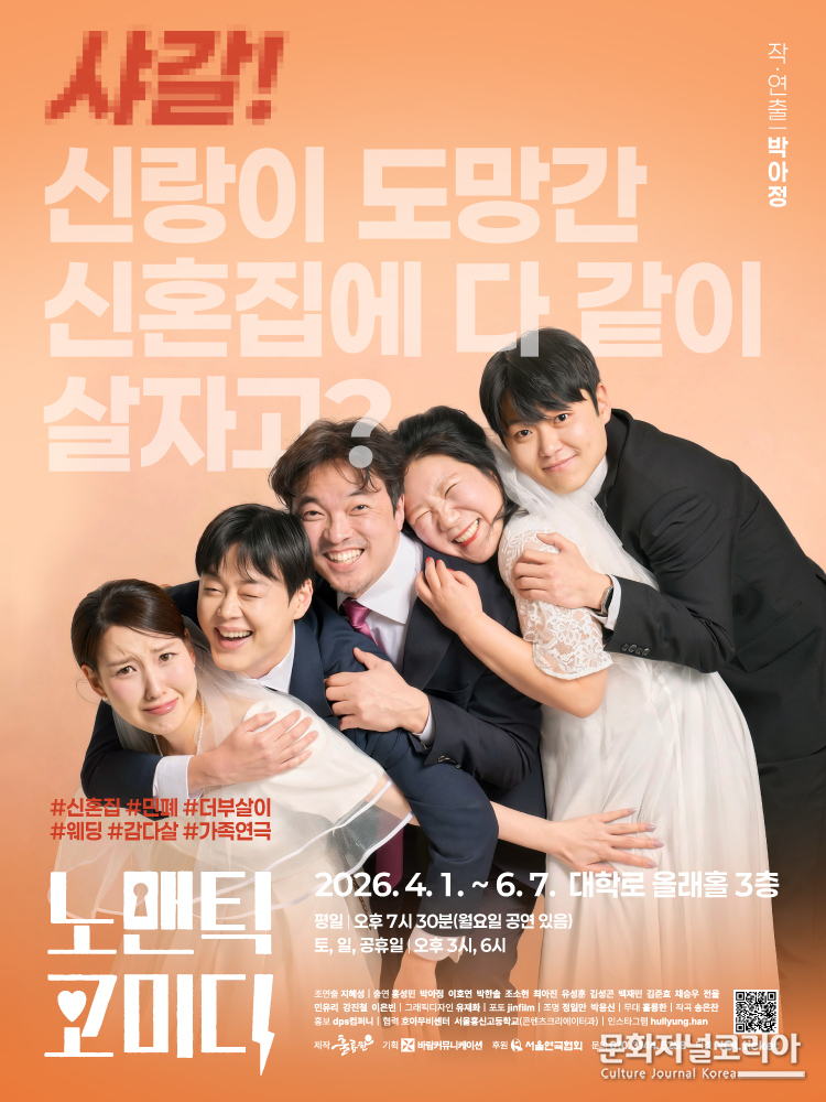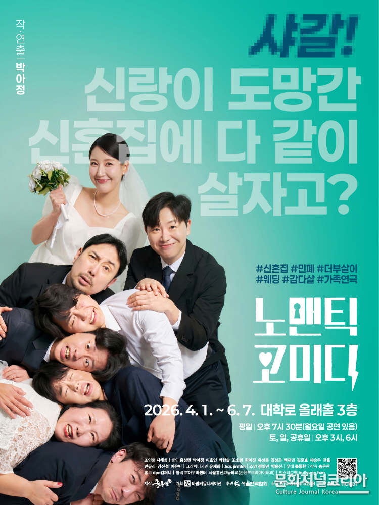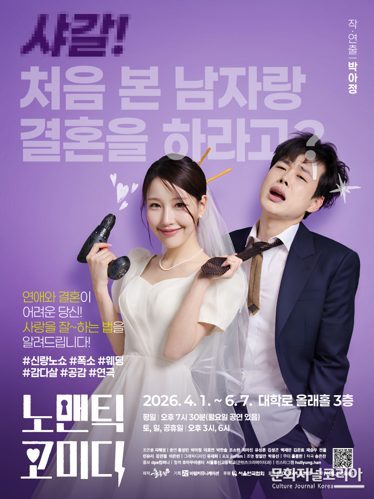 문화저널코리아 김영일 기자 | 대학로 창작 연극의 산실 Art crew 훌륭한 극단이 로맨틱이 아닌 노-맨틱 코미디라는 제목으로 작년 12월과 올해 대구 공연에서 관객들의 연애 세포를 깨우며 성황리에 마무리하고 따스한 봄바람과 함께 4월 1일 첫 공연을 시작으로 6월7일까지 화려한 막을 다시 올린다.