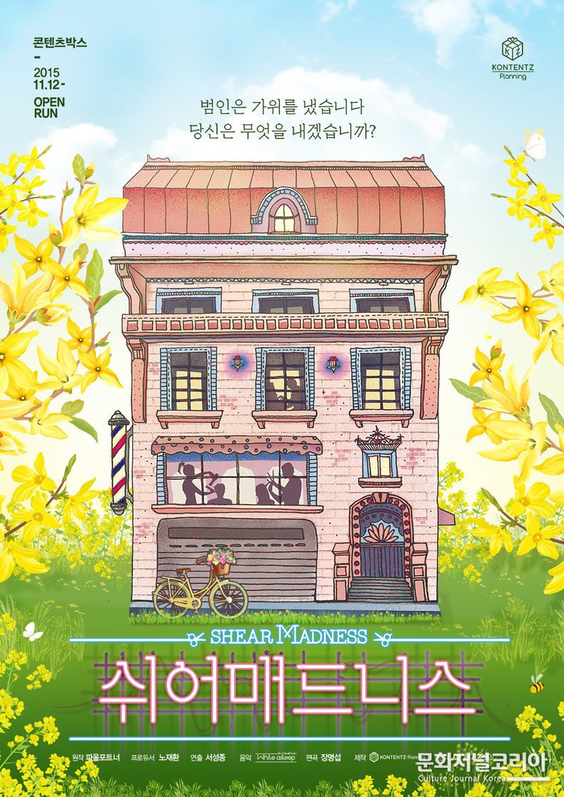특유의 재치 있는 대사와 관객이 직접 사건 해결에 참여하는 독특한 구성으로 호평받은 연극 <쉬어매드니스>(원작 파울 포트너, 프로듀서 노재환, 연출 서성종)는 1980년 미국 보스턴 초연 이래 ‘미국 역사상 최장기 공연’ 기네스 기록을 보유하며 미국뿐만 아니라 일본, 중국, 프랑스, 이탈리아, 독일 등 36개국에서 28개의 언어로 공연되며 전 세계적으로 꾸준히 사랑받고 있는 스테디셀러 극이다.