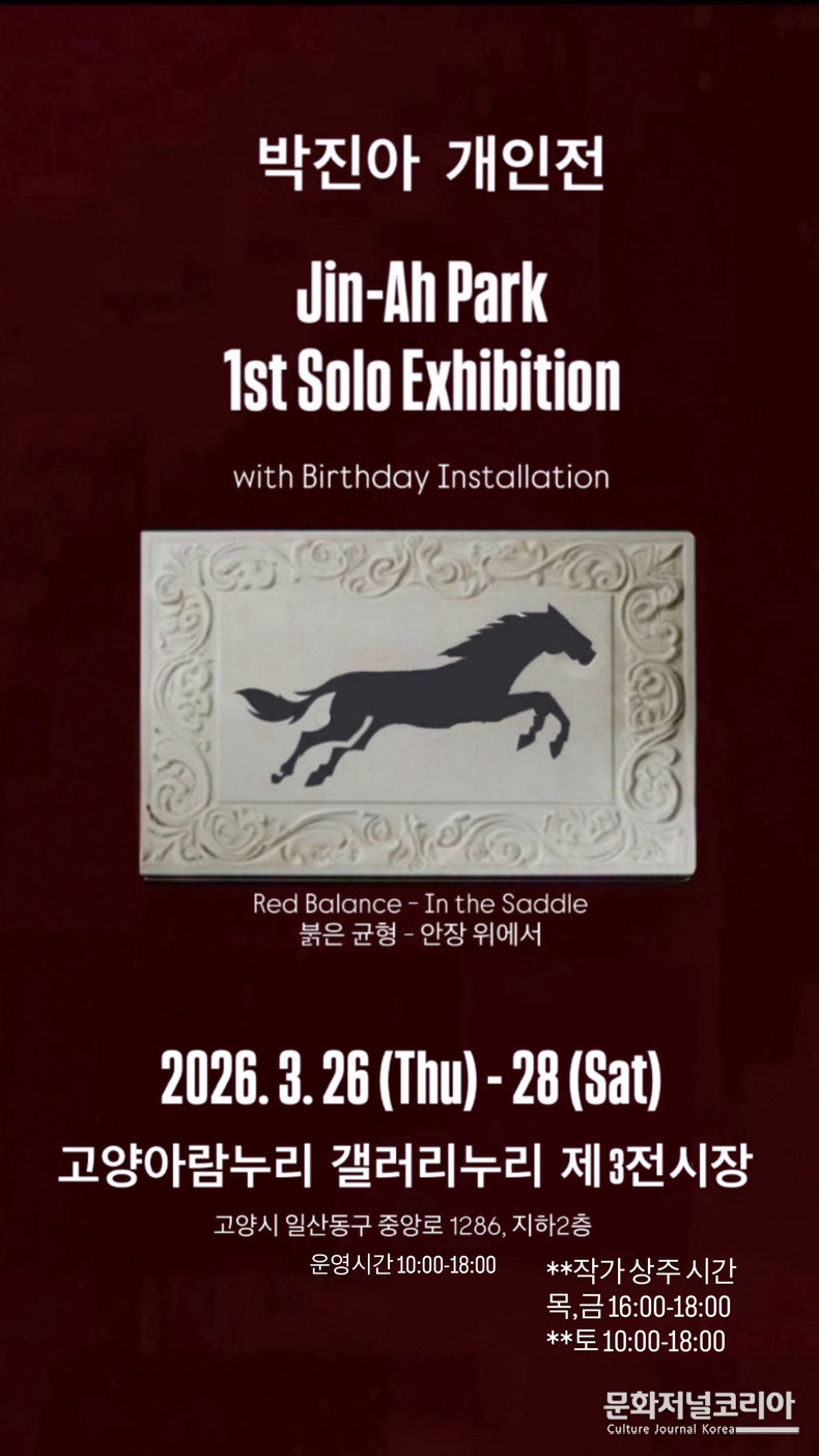 MBN 아나운서 박진아가 첫 개인전 '붉은 균형 - 안장 위에서(Red Balance - In the Saddle)'를 연다. 이번 전시는 3월 26일부터 오는 28일까지 고양아람누리 갤러리누리 제3전시장에서 열린다. 방송인으로 익숙한 이름이지만, 이번 전시는 그가 오랫동안 축적해온 또 하나의 시간, 곧 회화 작업의 내면을 전면에 내세우는 자리다.