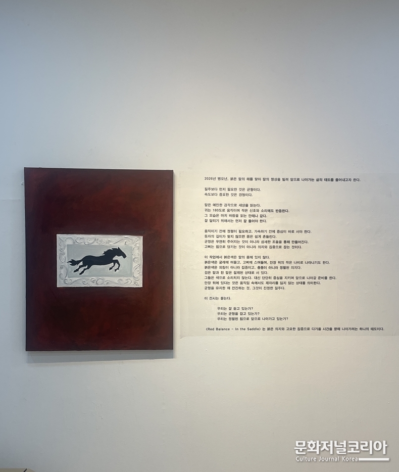 박진아는 말의 형상과 붉은 기호를 통해 그 질문을 조용하지만 선명하게 화면 위에 올려놓는다. 질주가 미덕이 된 시대에, 이 전시는 더 빨리 달리는 법보다 먼저 흔들리지 않고 앞으로 나아가는 법을 묻는다. 어쩌면 지금 우리에게 필요한 것은 더 강한 발굽이 아니라, 그 발굽을 끝내 무너지지 않게 만드는 자기 안의 균형감각인지도 모른다.