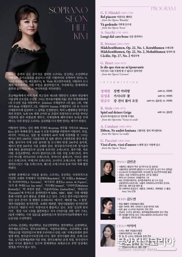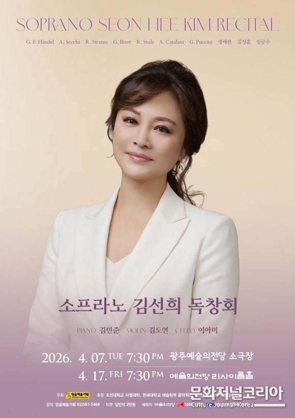 한편 이번 독창회는 헨델, 세키, 슈트라우스, 비제, 카탈라니, 정애련등 가곡부터 오페라, 한국가곡등 다양한 레파토리로 구성되어 오랜 시간 무대와 교육 현장을 넘나들며 축적해온 소프라노 김선희의 음악 인생과 예술적 깊이를 오롯이 만날 수 있는 자리로, 클래식 애호가들에게 깊은 감동과 울림을 전하는 뜻깊은 무대가 될 것으로 기대를 모은다. 본 공연은 일반석 2만원으로 예술의전당과 NOL티켓에서 예매 가능하다.