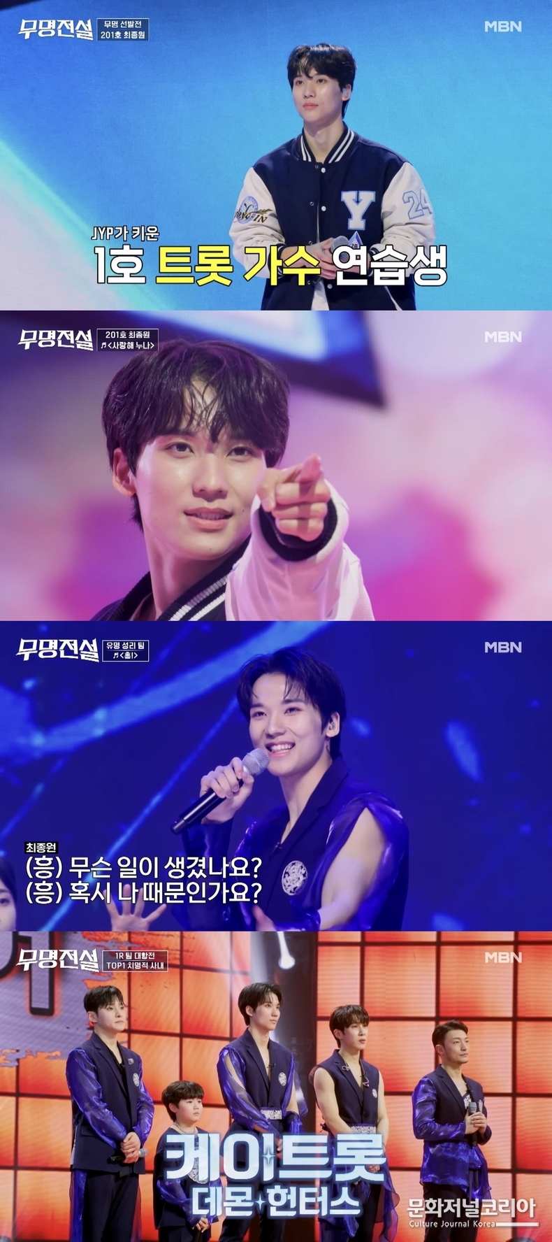 차근차근 실력을 쌓은 최종원은 ‘무명전설’에 출연해 차세대 트로트 기대주로서의 잠재력을 입증하고 있다. 색다른 콘셉트로 변신을 거듭하며 매번 새로운 무대를 보여주고 있는 최종원이 ‘무명전설’에서 보여줄 활약에 기대가 모인다.