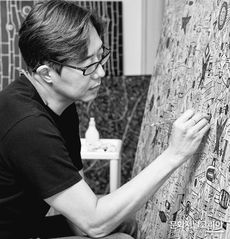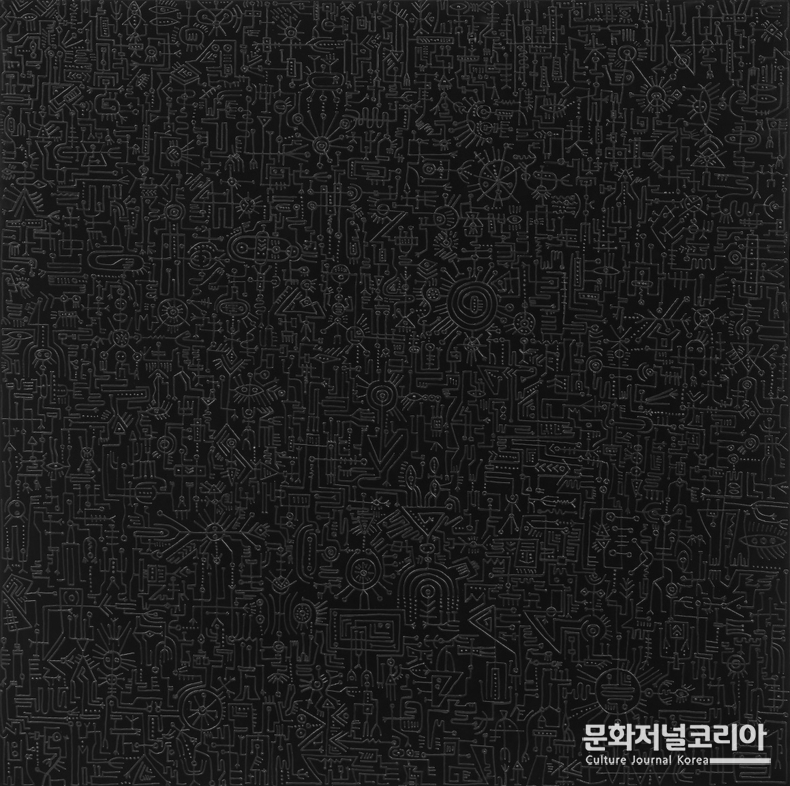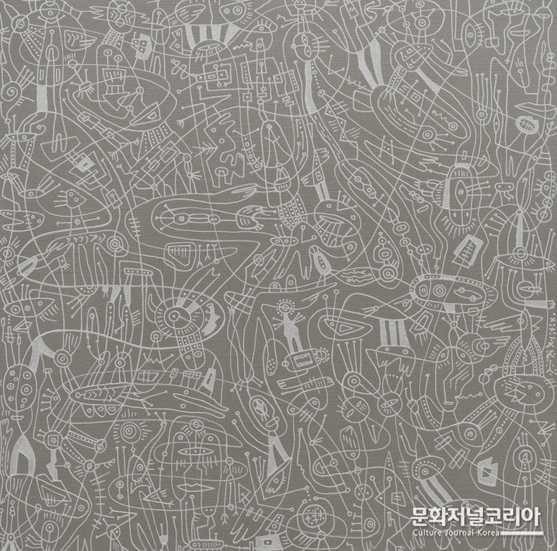 최비오는 비가시적 시공간의 진동을 리드미컬한 선과 추상적 기호로 시각화해온 작가다. 그의 작업은 우주와 인간, 물질과 감각이 분리되지 않고 하나의 장(field) 안에서 연결된다는 동양적 세계관을 바탕으로 한다. 화면 위에 반복되고 중첩되는 선과 기호들은 특정 대상을 묘사하기보다, 보이지 않는 흐름과 감각이 남긴 흔적을 드러낸다. 이로써 회화는 단순한 재현의 매체를 넘어 시간과 에너지의 흐름이 머무르고 기록되는 '장'으로 기능하게 된다.