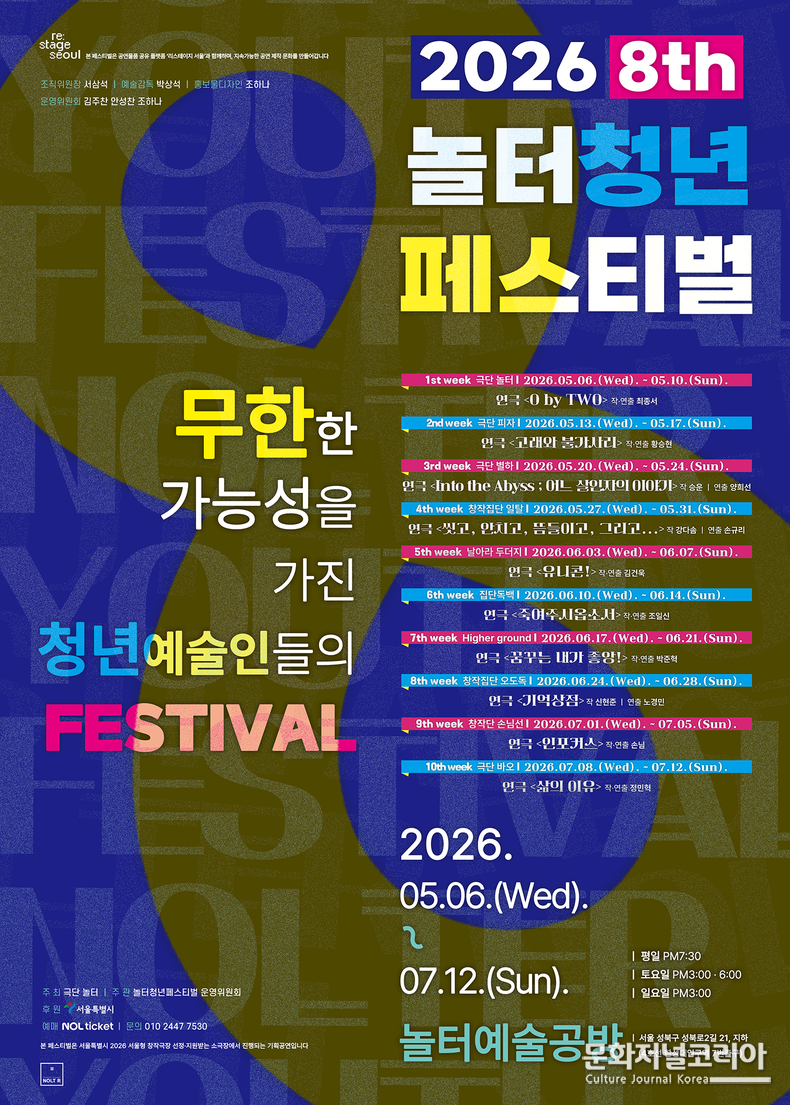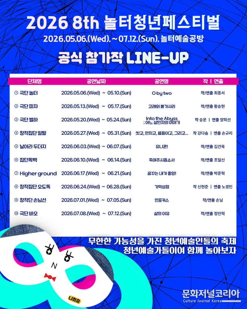 오는 5월 6일부터 7월 12일까지 진행되는 제8회 놀터청년페스티벌에서는 주최 측인 극단 놀터의 ‘O by TWO’ 공연을 시작으로 총 10개의 단체들이 참여하며 청년으로서 마주하는 현실과 불안, 관계와 정체성, 그리고 예술에 대한 고민까지 다양한 시선으로 풀어내며 관객과 만난다.