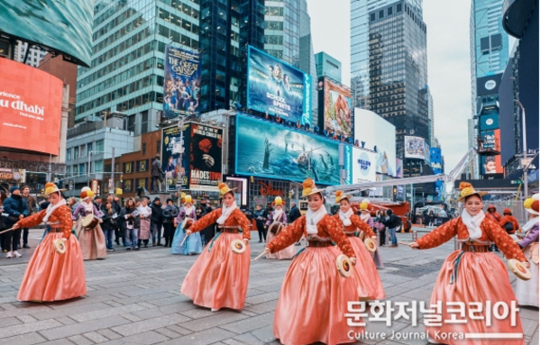 문화저널코리아 오형석 기자 |국가유산청(청장 허민)과 국가유산청 산하 국가유산진흥원(원장 이귀영)은 뉴욕한국문화원(원장 김천수)과 함께 미국 뉴욕에서 2월 11일(현지시간) ‘국가유산 방문 캠페인’ 홍보 행사 <코리아 온 스테이지 인 뉴욕(Korea on Stage in New York)>의 막을 성대하게 올렸다. ‘Golden Blessings: Discovering Korean Cultural Heritage(빛의 축원: 찬란히 빛나는 한국의 유산들)’을 주제로 기획된 이번 행사는 타임스스퀘어 광장에서 국가유산 영상 송출과 특별공연을 시작으로 ▲미디어아트, ▲전통예술 공연, ▲사찰음식 체험 등 한국 국가유산의 독보적인 가치를 세계에 알렸다. 지난 9일부터 세계 최고의 광고 무대인 타임스스퀘어 대형 전광판에 대한민국 국가유산을 알리는 광고 영상을 송출하고 있다. 한국을 대표하는 국가유산, 전통공예, 궁중무용 등 오늘날 전 세계를 열광시킨 K-컬처의 원형을 감각적인 영상으로 담아냈다. 11일 오후 3시 타임스스퀘어 광장에서는 우리 전통무용의 아름다움을 미국 현지에서 알리고 있는 ‘춤누리 한국전통무용단(KTDOC)’과 국가유산진흥원 예술단의 특별공연