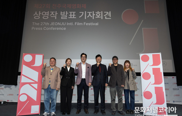 문화저널코리아 오형석 기자 |제27회 전주국제영화제(공동집행위원장 민성욱·정준호)가 3월 31일(화) 제27회 전주국제영화제 상영작 발표 기자회견을 마치며 영화제의 본격적인 시작을 알렸다. 상영작 발표 기자회견은 3월 31일(화) 전주디지털독립영화관과 CGV 용산아이파크몰 11관에서 두 차례 진행됐다. 전주 기자회견에는 윤동욱 전주국제영화제 조직위원장 권한대행, 민성욱·정준호 공동집행위원장, 문석·문성경·김효정 프로그래머가 참석했다. 서울 기자회견에는 민성욱·정준호 공동집행위원장, 문석·문성경·김효정 프로그래머를 비롯해 올해의 프로그래머 변영주가 자리했다. 윤동욱 전주국제영화제 조직위원장 권한대행은 개회사에서 “그동안 전주국제영화제는 세계 각국의 창의적인 영화인들이 관객과 소통하며 창작의 세계를 펼칠 수 있는 소중한 플랫폼이자 아시아를 대표하는 영화제로 자리매김해 왔다”라며 전주국제영화제의 역할을 강조했다. 민성욱 공동집행위원장은 “연임하게 되면서, 영화제를 계속 이어갈 수 있게 된 것에 대해 감사와 책임을 느끼고 있다”며 “영화제가 지켜온 가치를 바탕으로 전주다운 작품들과 프로그램을 준비하고 있으니 풍성한 영화 축제를 함께 즐겨주길 바란다”고 밝혔다. 정준