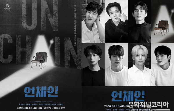 문화저널코리아 김영일 기자 | 연극 <언체인>(연출: 이재준 / 극작: Sneil)이 오는 2026년 6월 16일부터 9월 6일까지 대학로 YES24스테이지 2관에서 공연된다. 2017년 초연 이후 2019 재연과 2020년 삼연까지 세차례 시즌을 거치며 작품 특유의 치밀한 심리 서사를 구축해온 이 작품은, 제한된 공간 안에서 켜켜이 쌓이는 긴장감과 인물의 심리를 세밀하게 따라가는 전개를 통해 평단과 관객의 꾸준한 주목을 받아왔다. 약 6년여만의 무대가 되는 이번 시즌 역시 <언체인> 특유의 날 선 리듬과 압도적인 분위기를 다시 한번 확인할 수 있는 무대가 될 것으로 기대를 모은다. 연극 <언체인>은 실종된 딸 ‘줄리’를 둘러싼 두 인물의 대면을 통해 기억과 진실, 죄의식과 연민이 교차하는 과정을 밀도 있게 펼쳐내는 2인 심리극이다. 마크는 불안정하고 흐릿한 기억 속에 머물러 있는 싱어를 집요하게 압박하며 사건의 실마리를 좇고, 싱어는 지워진 기억의 흔적을 더듬으며 혼란스러운 진실과 맞닥뜨리게 된다. 작품은 사건을 풀어가는 과정 자체보다, 그 과정에서 드러나는 두 인물의 관계와 심리에 집중한다. 서로를 밀어붙이고 버티는 대화,