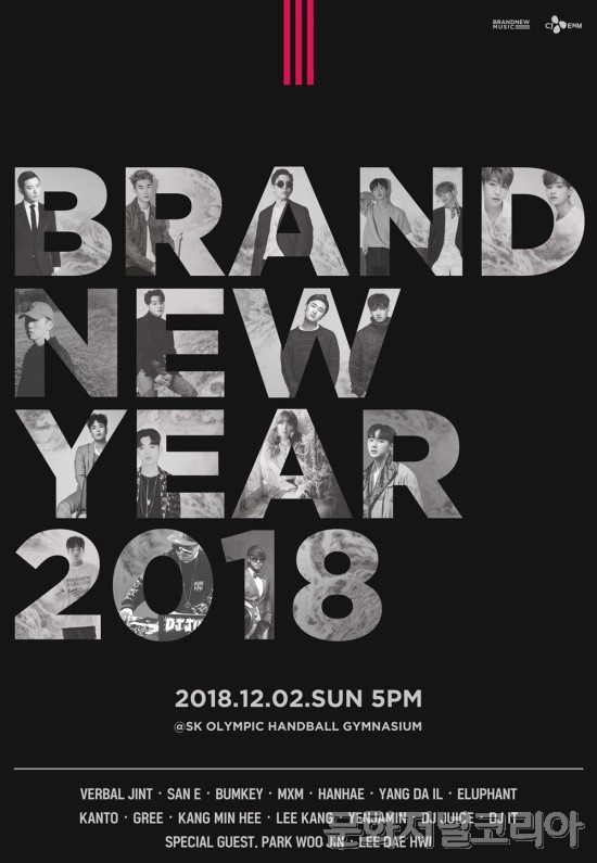 ‘BRANDNEW YEAR 2018’은 오는 12월 2일 오후 5시 올림픽공원 SK올림픽핸드볼경기장에서 열리는 브랜뉴뮤직 소속 아티스트가 모두 참여하는 패밀리 콘서트로 버벌진트, 산이, 범키를 비롯해 한해, 양다일, MXM, 이루펀트, 칸토, 그리, 강민희, 이강, 옌자민, DJ JUICE, DJ IT 등 브랜뉴뮤직의 개성강한 뮤지션들이 무대에 오른다.