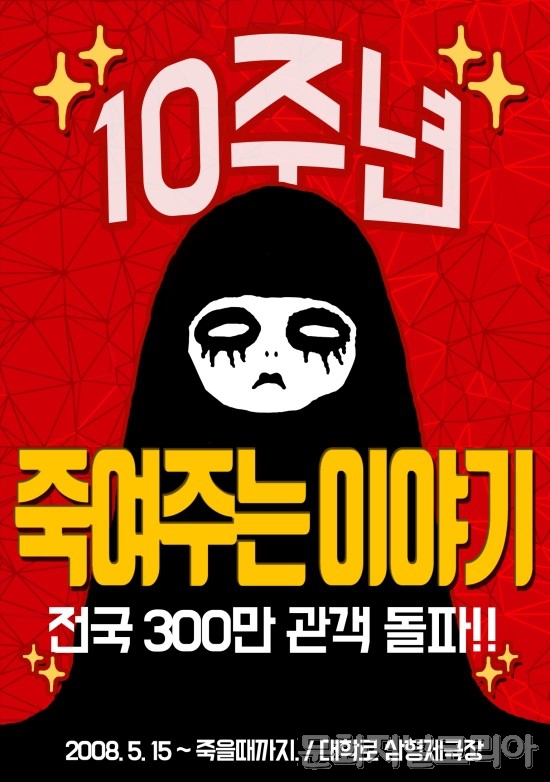 죽음이라는 무거운 주제를 해학적으로 해석한 블랙코미디 연극 ‘죽여주는이야기’는 전국 300만 관객을 돌파하며,공연장 앞 연일 관객대기행렬로 일명 ‘죽여주는 명물거리’까지 탄생시킨 대학로의 대표 공연이다.