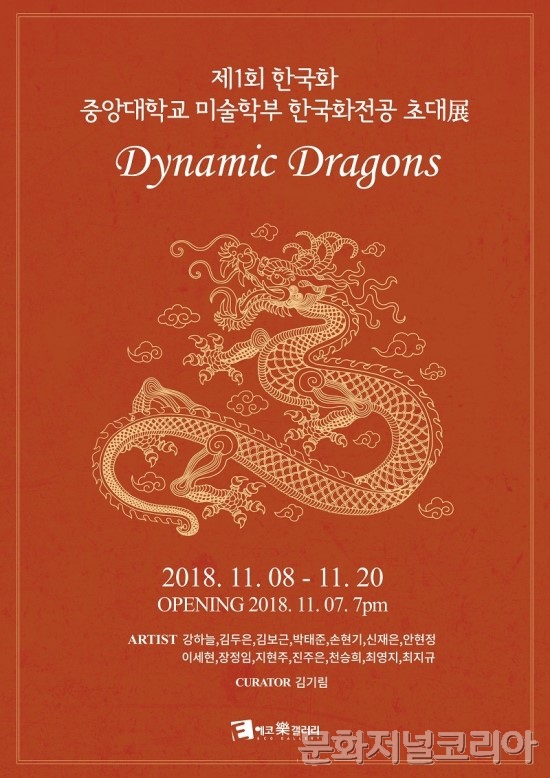 에코락(樂)갤러리는 오는 11월 8일부터 11월 20일까지 제1회 한국화 <중앙대학교 미술학부 한국화 전공 초대展 "Dynamic Dragons”>을 개최합니다.