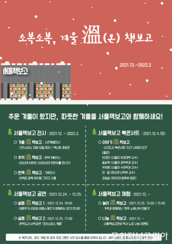 11월 30일부터 2022년 2월 13일까지 운영되는 <시즌 특별 전시 ‘겨울 溫 책보고’>는 ‘서울책보고’를 방문한 시민들에게 특별한 볼거리를 제공할 것이다. 헌책을 활용한 트리 오브제와 대형 모빌 크리스마스 트리, 크리스마스와 관련된 명작 도서 전시, 고풍스러운 느낌이 가득한 벽난로 포토존 등으로 공간을 꾸민다. 창고 형태의 회색빛 외벽은 눈꽃 모양 LED가 설치되어 보다 멋진 모습으로 시민들의 눈길을 사로잡을 예정이다.