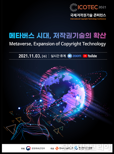 문화저널코리아 김영일 기자 | 문화체육관광부는 한국저작권위원회, 한국저작권보호원, 세계지식재산기구(WIPO), 국가지식재산위원회와 함께 11월 3일 오전 10시, 포시즌스 호텔(서울 종로구)에서 ‘2021 국제저작권기술 콘퍼런스(ICOTEC)’를 개최한다.