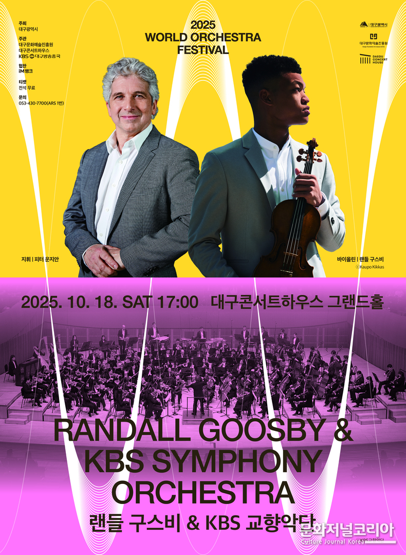 문화저널코리아 오형석 기자 | 2025 월드오케스트라페스티벌의 KBS교향악단 공연이 오는 18일 오후 5시 대구콘서트하우스 그랜드홀에서 열린다. KBS교향악단이 출연하는 이번 공연에는 70대 거장 지휘자 피터 운지안과 20대 스타 바이올리니스트 랜들 구스비가 협연자로 나서, 세대를 아우르는 특별한 무대를 선보인다.
