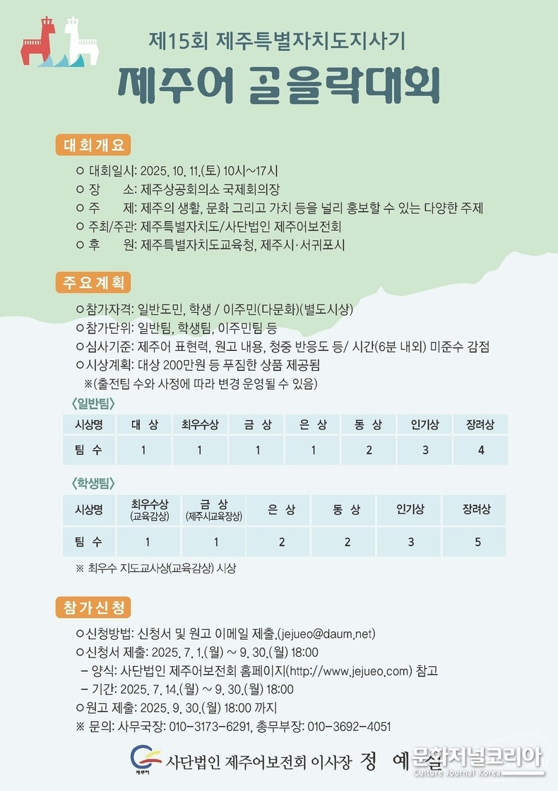 문화저널코리아 오형석 기자 | 제주 고유의 언어, 제주어를 생활 속에서 되살리려는 노력이 지역 사회에서 다시금 힘을 얻고 있다. 오는 10월 11일(토) 오전 10시부터 오후 5시까지 제주상공회의소 국제회의장에서 열리는 '제15회 제주특별자치도지사기 제주어 ᄀᆞᆯ을락대회'가 그 무대다.